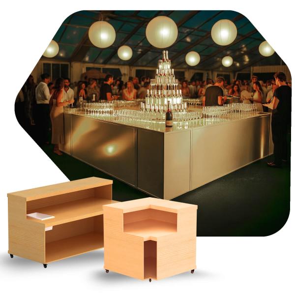 Elevate your event setup with the Modular Two Tier Bar, a fully customizable and collapsible system that adapts to your space, style, and service needs. Designed for versatility and functionality, each layout offers different configurations using straight and corner pieces. Perfect for weddings, galas, or branded corporate events, this modular bar allows you to build your dream bartending station piece by piece.