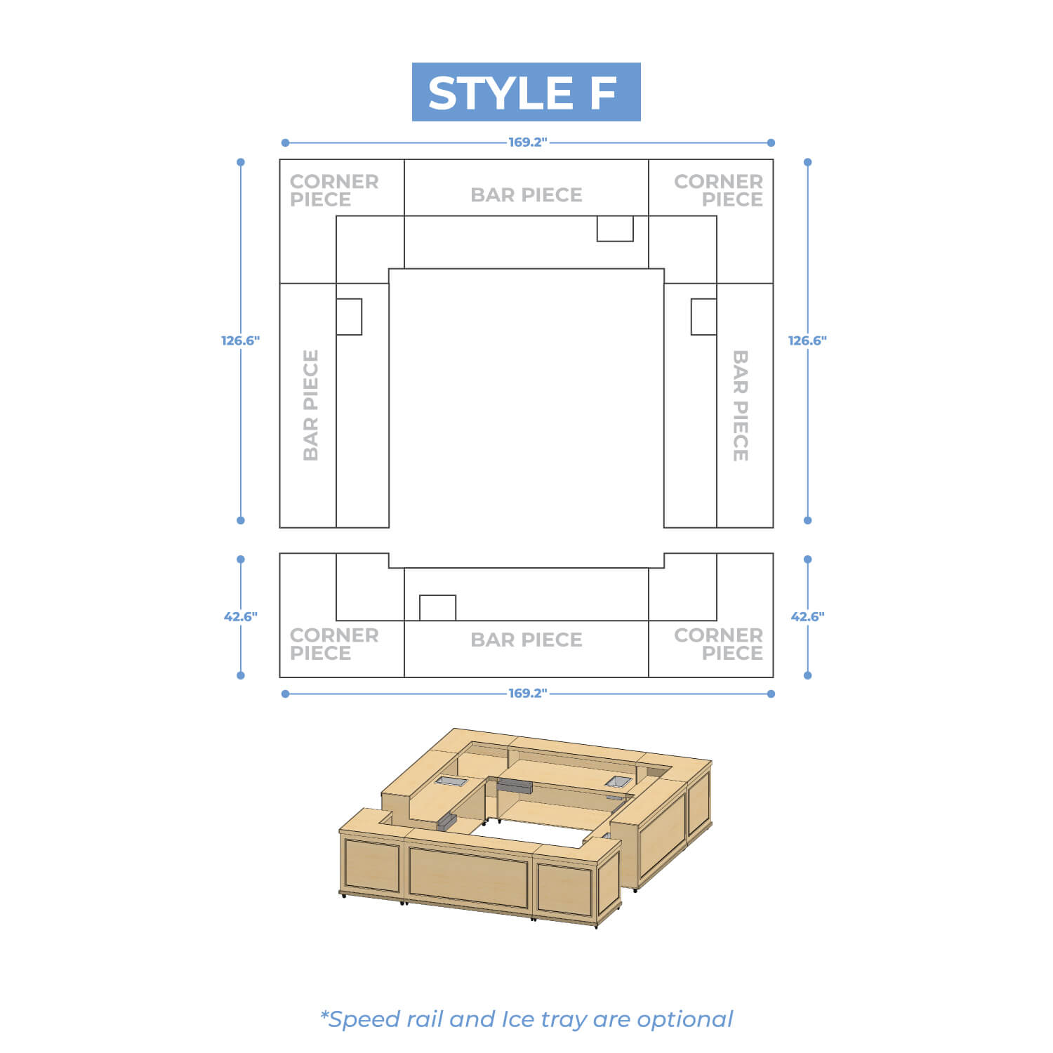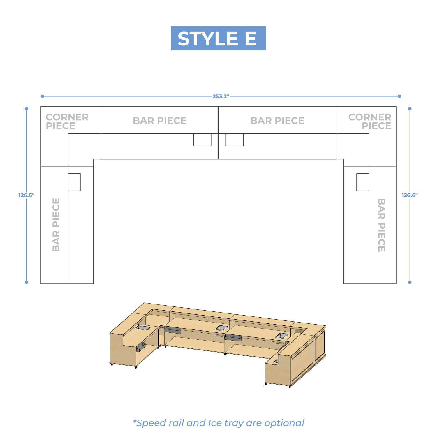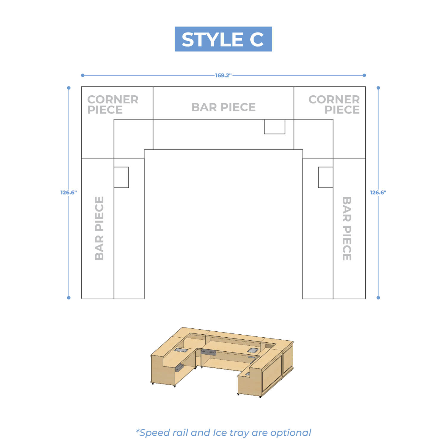 Each layout configuration uses a unique combination of straight and corner pieces to create your desired bar shape. Use the image as a visual guide and refer to the breakdown below: