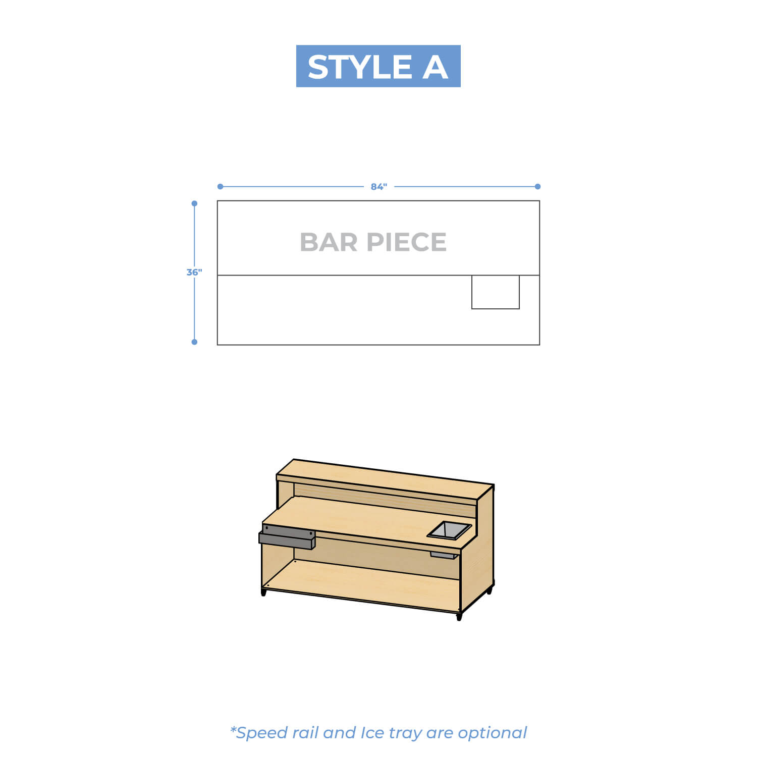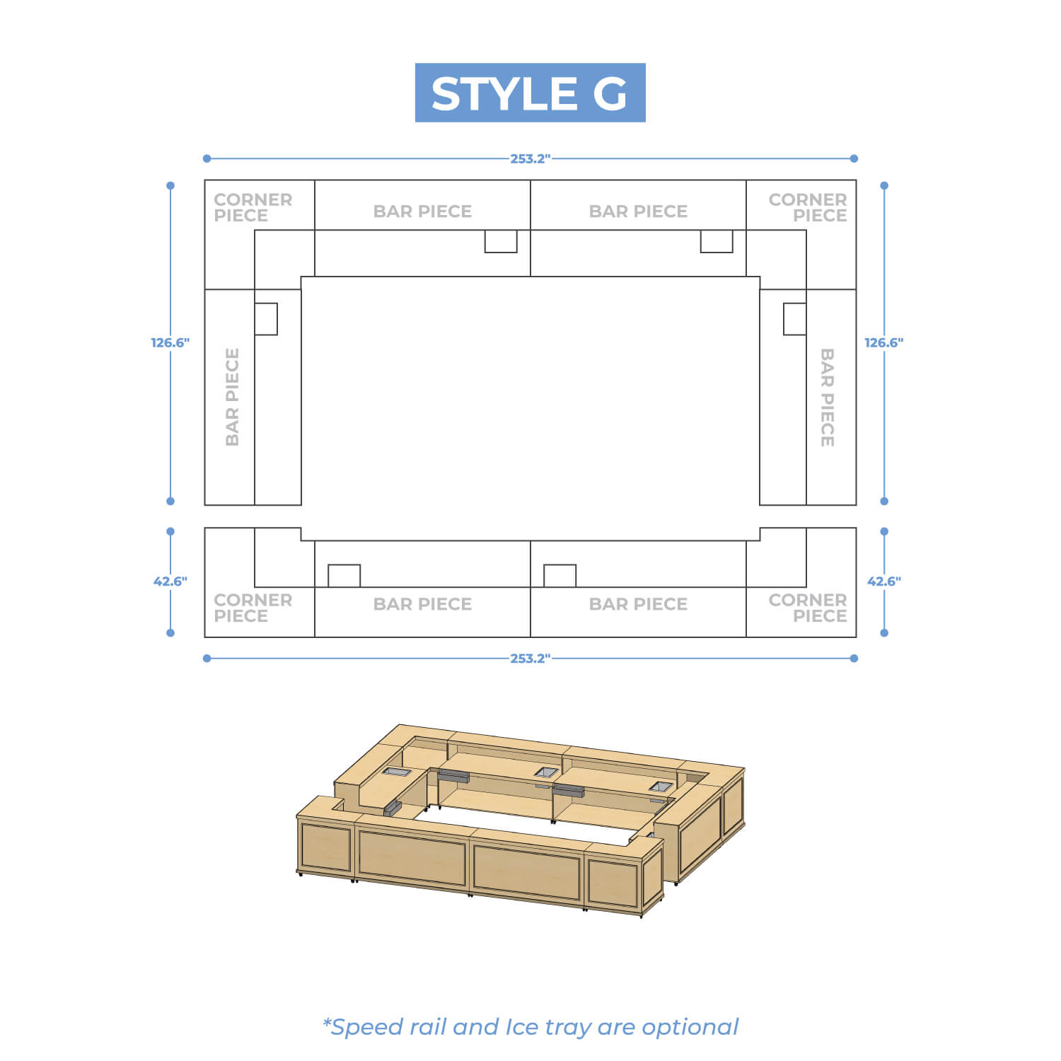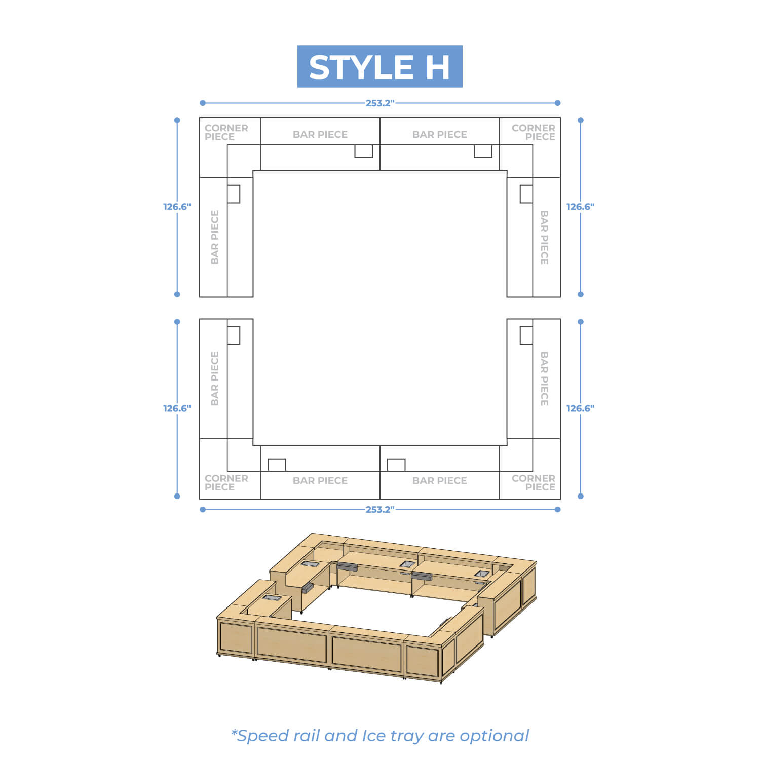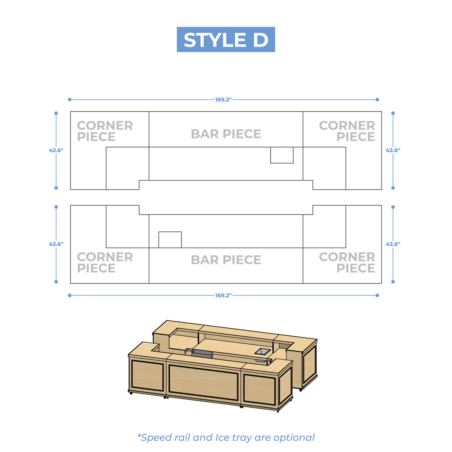 Each layout configuration uses a unique combination of straight and corner pieces to create your desired bar shape. Use the image as a visual guide and refer to the breakdown below: