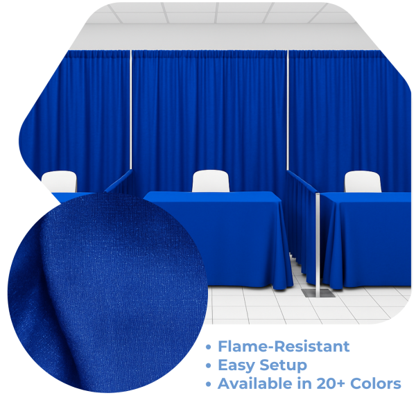 For Booth or Back wall designs we recommend using approx. 3 to 4 panels per 10ft section depending on how gathered you want your drape to look.