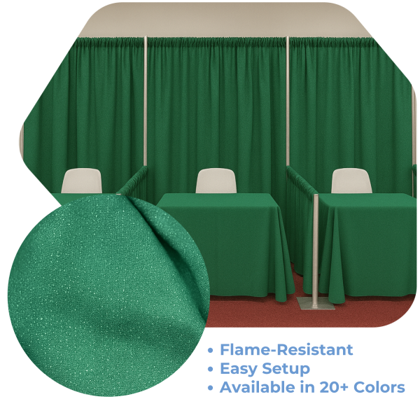 For Booth or Back wall designs we recommend using approx. 3 to 4 panels per 10ft section depending on how gathered you want your drape to look.