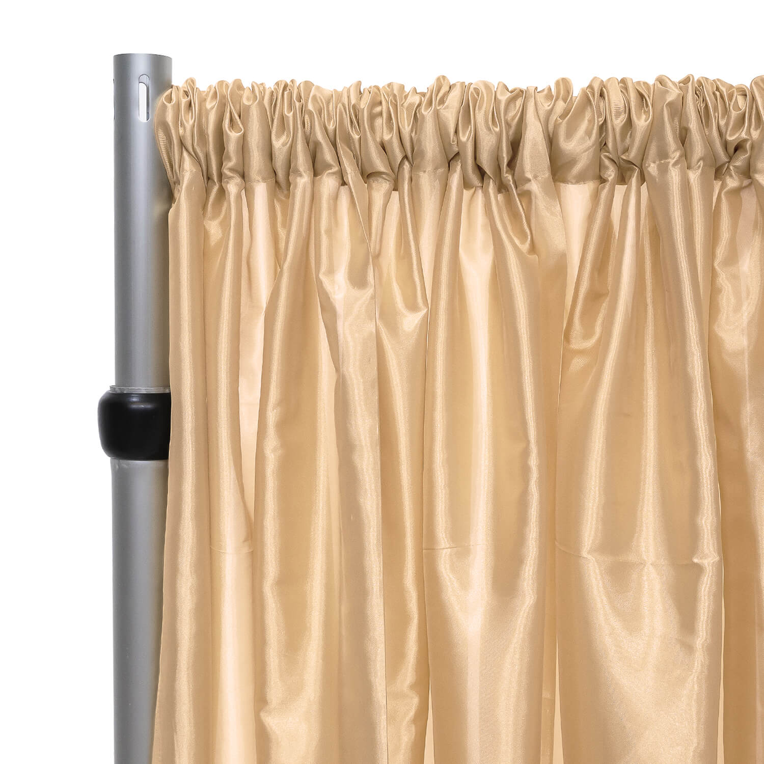 The FR Taffeta Drape Panel by Eastern Mills in Light Champagne adds a warm and inviting touch to any event. Perfect for creating cozy backdrops or room dividers, this 9-12 ft wide panel features a smooth taffeta texture. The 4" sewn rod pockets ensure seamless installation. Trust Event Decor Direct to provide high-quality products that enhance your decor with warmth and elegance.