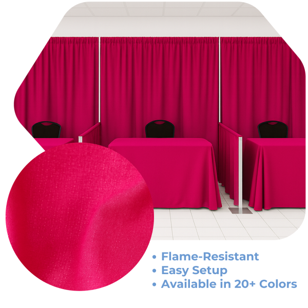 For Booth or Back wall designs we recommend using approx. 3 to 4 panels per 10ft section depending on how gathered you want your drape to look.