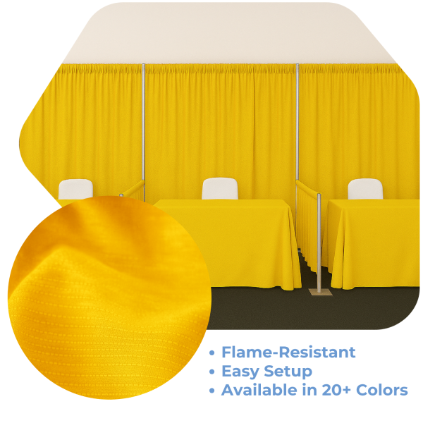 For Booth or Back wall designs we recommend using approx. 3 to 4 panels per 10ft section depending on how gathered you want your drape to look.